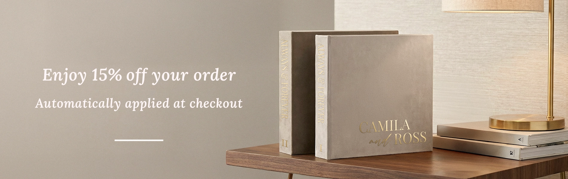 Pictured: Taupe color, Gold foil writing, Writing font #4