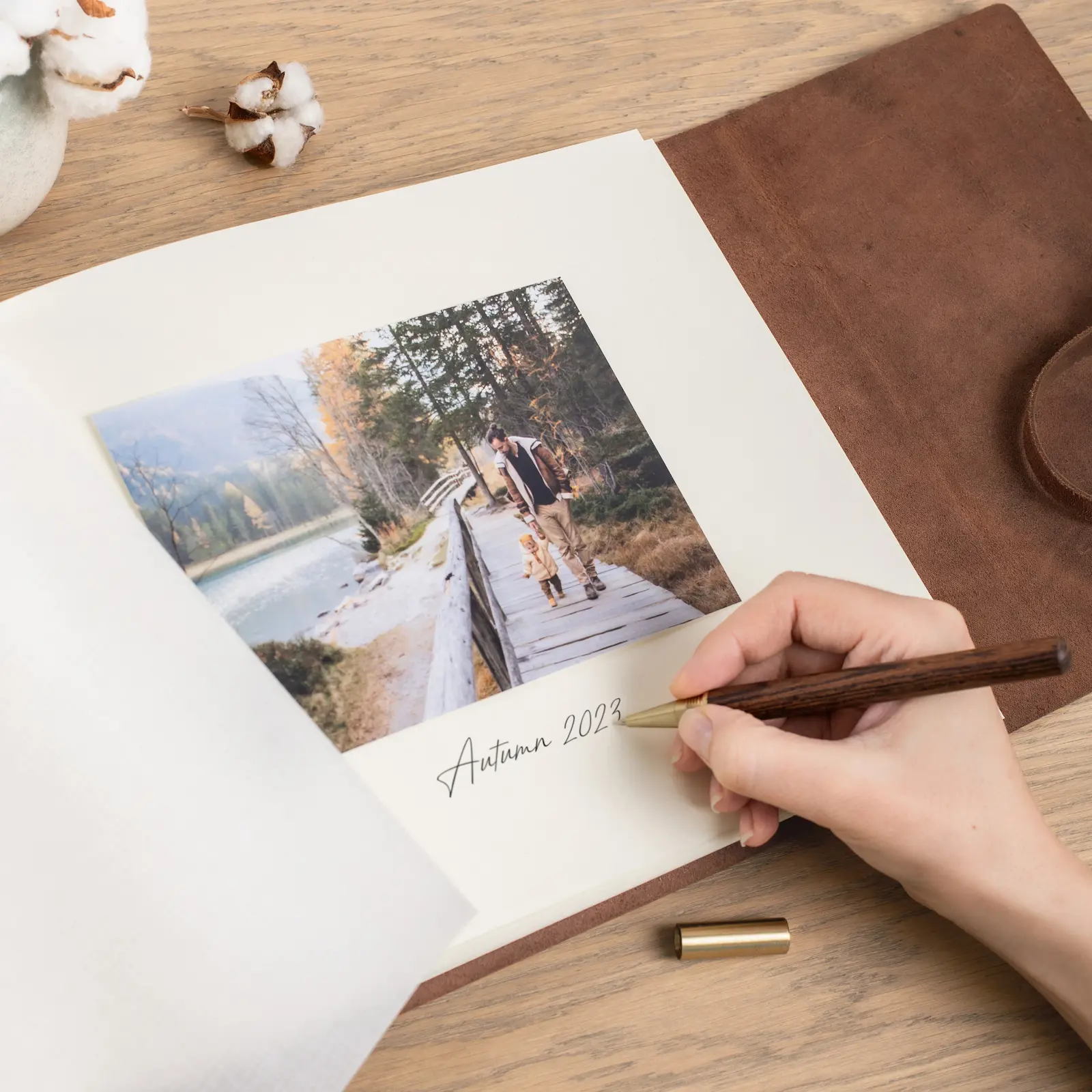 It is a traditional photo album with blank pages, so we recommend that you use photo splits or photo corners to put your photos into the album: