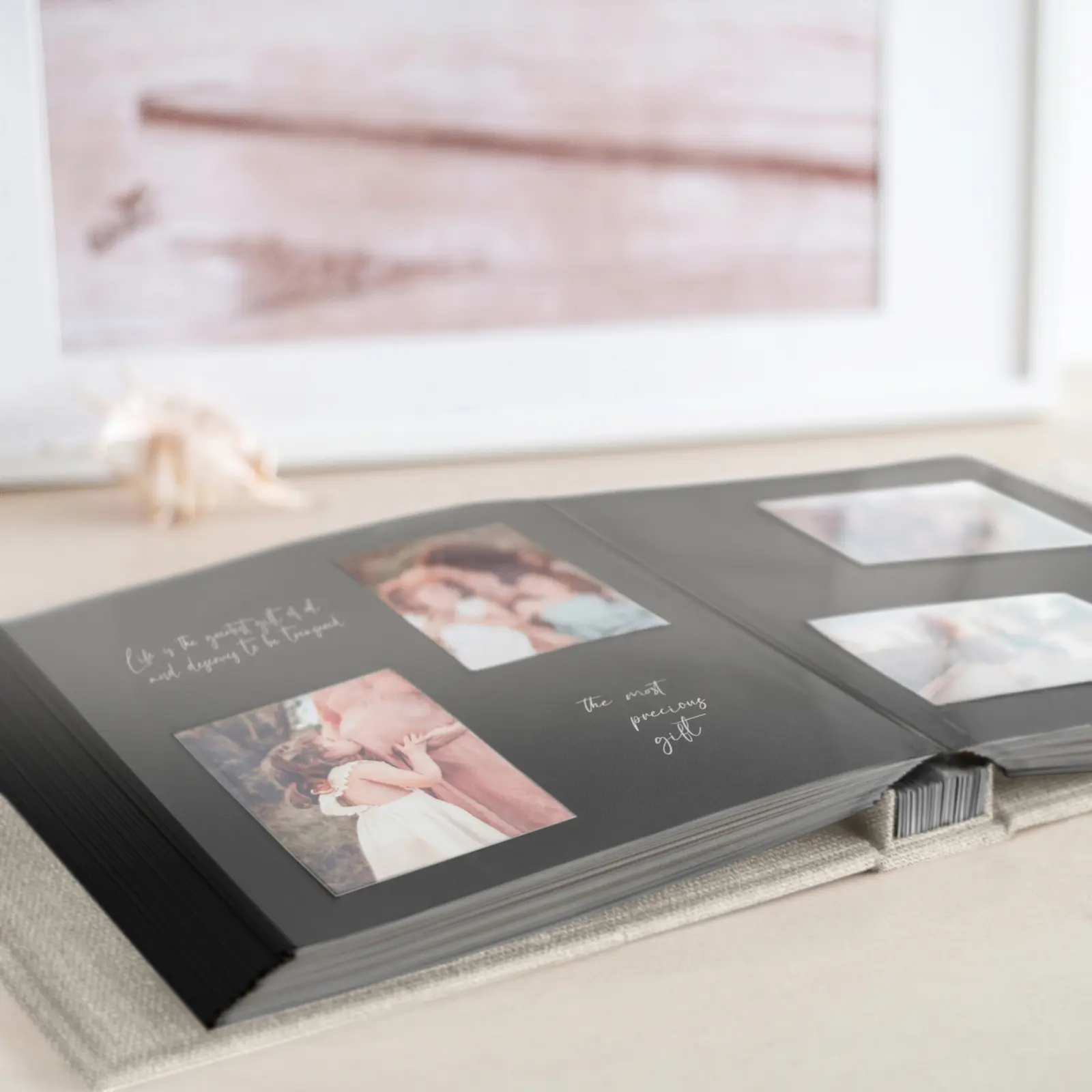 This handcrafted self-adhesive album lets you arrange your photos just the way you like. Simply lift the clear sheet, place your picture on the adhesive page, and smooth it back down — no marks, no mess.
