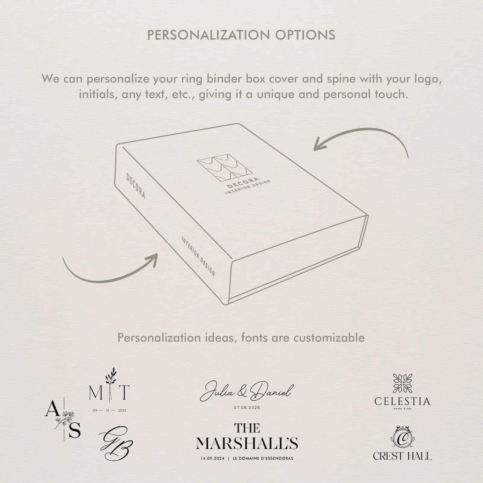 Personalization is at the heart of our design. With an array of custom options, you can transform this ring binder into a unique portfolio that reflects your brand or personal style. Whether it's for a corporate presentation, a personal portfolio, or an academic thesis, your custom text or logo will be displayed prominently, creating a lasting impression.