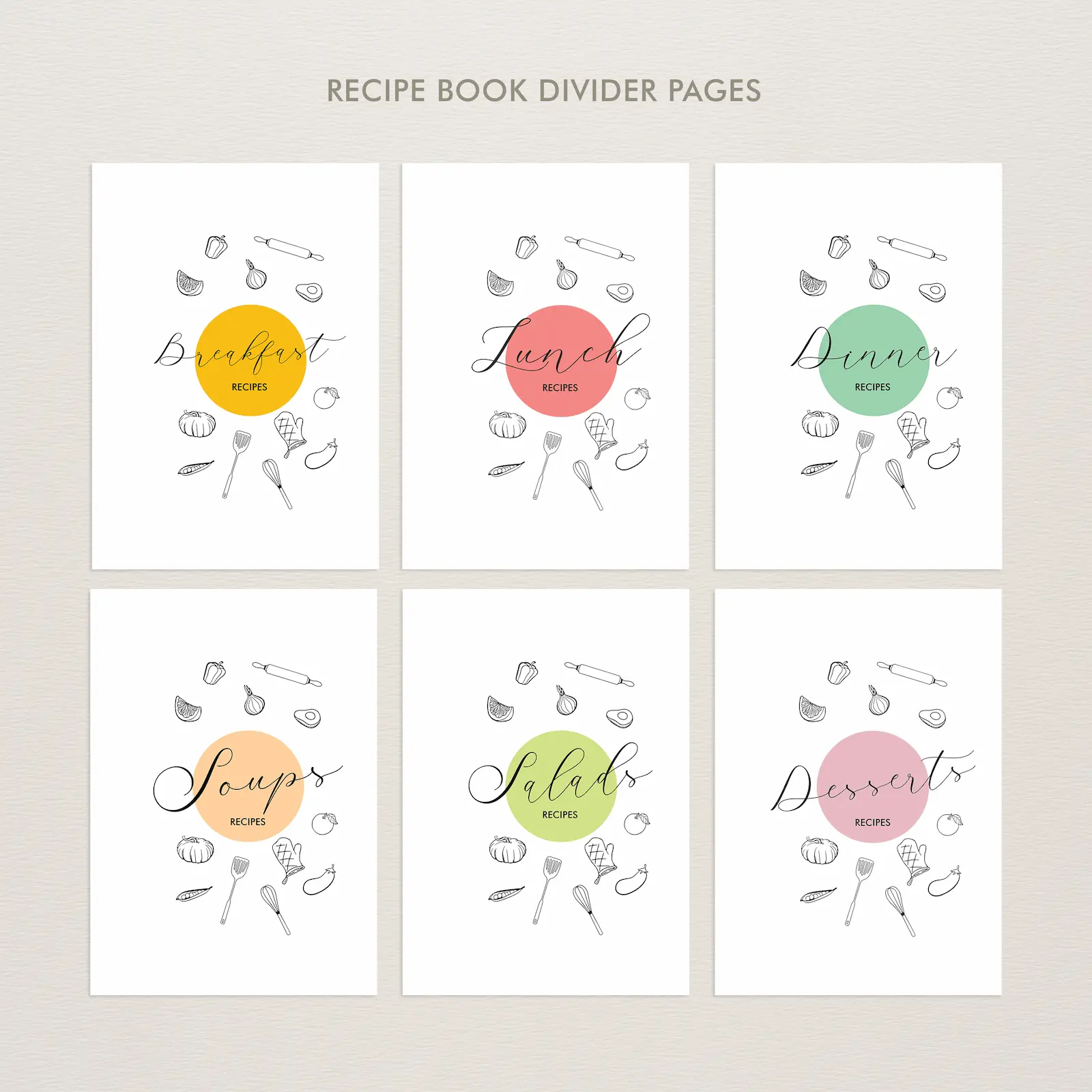 10 Recipe book divider pages (Breakfast, Dinner, Lunch, Kids, Main Dishes, Meat, Salads, Snack,
